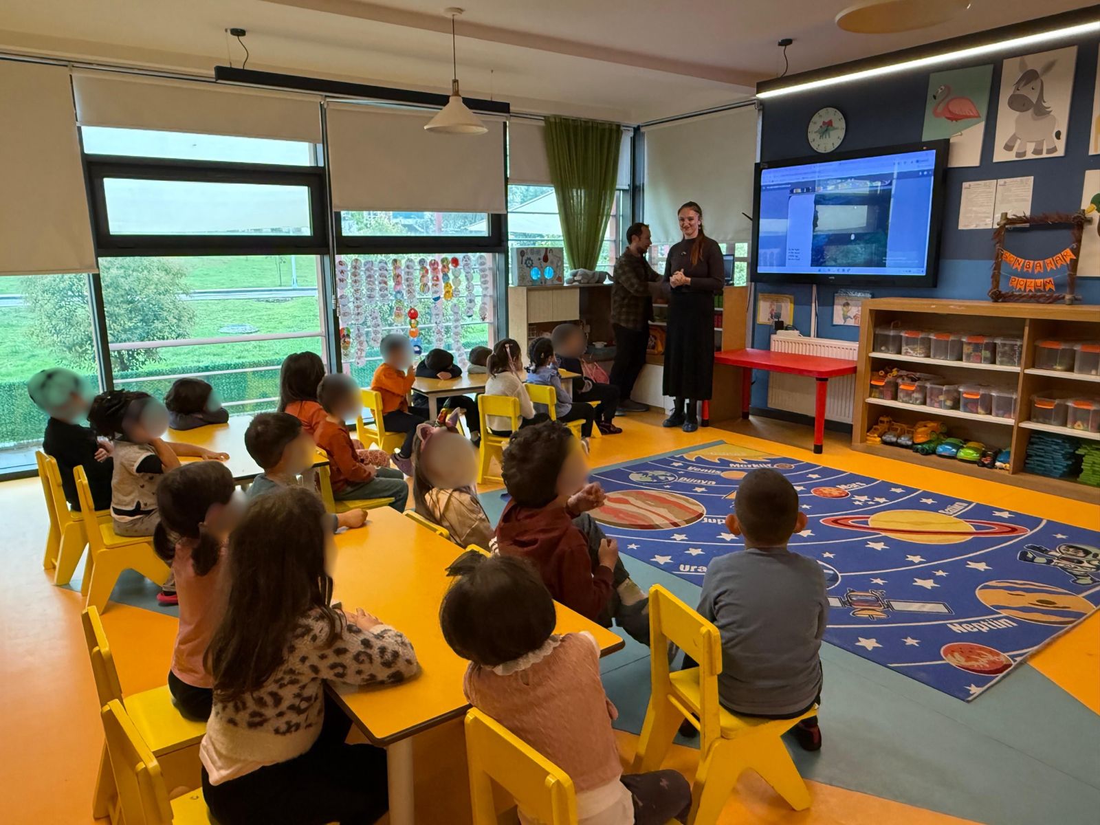 Öğr. Gör. Fevzi Umut Özçelik ve Öğr. Gör. Hailey Autumn Hesseltine, Toplumsal Katkı Çalışmaları kapsamında Düriye Çetinceviz Anaokulu’nda İngilizce kitap okuma etkinliği düzenledi.